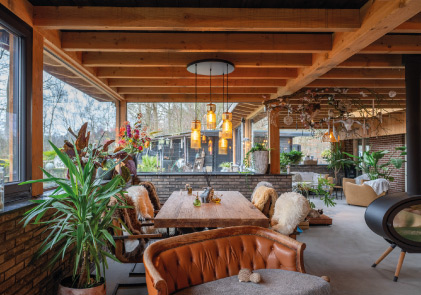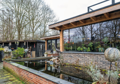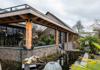 Realisatie van een tuinkamer met Douglas overkapping en vijver. Door de toegepaste lichtstraten valt extra daglicht binnen, zowel in de tuinkamer als in de bestaande woning. De binnen- en buitenzijde zijn afgewerkt met steenstrips en grote glaspartijen. Bovenop de uitbouw is een dakterras gerealiseerd met een glasbalustrade.